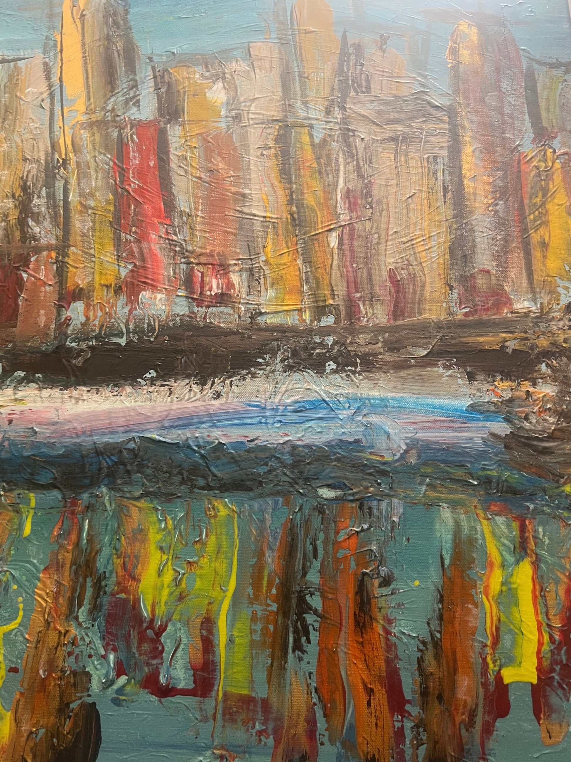 Each brushstroke carries the rhythm of reflection — like a city mirrored on still waters.